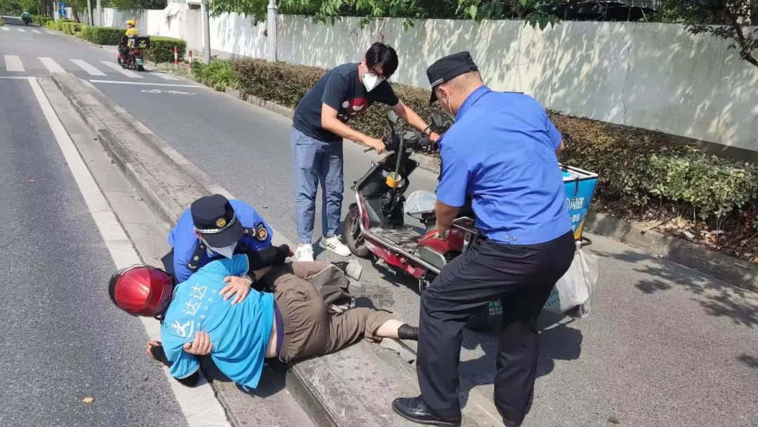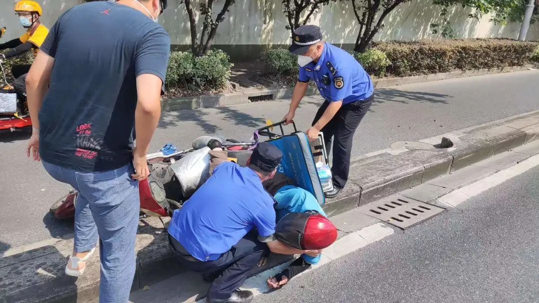 执法队员分成两路,王伟、汪雨辰帮助其捡拾散落在地上的快递包裹和手机等物品,并扶起电瓶车推到路边;荆治忠、朱竟成则上前查看伤者情况,了解到由于天气炎热,配送员突然感到有些头晕,随后眼前一黑摔倒在地。