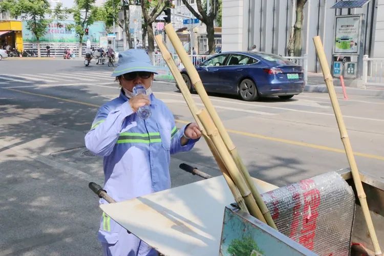 前来取水的环卫工人徐剑芬说:“每天烈日下来回清扫,身上都要晒脱一层皮,为了解渴,我们每天要喝10多斤的茶水。”