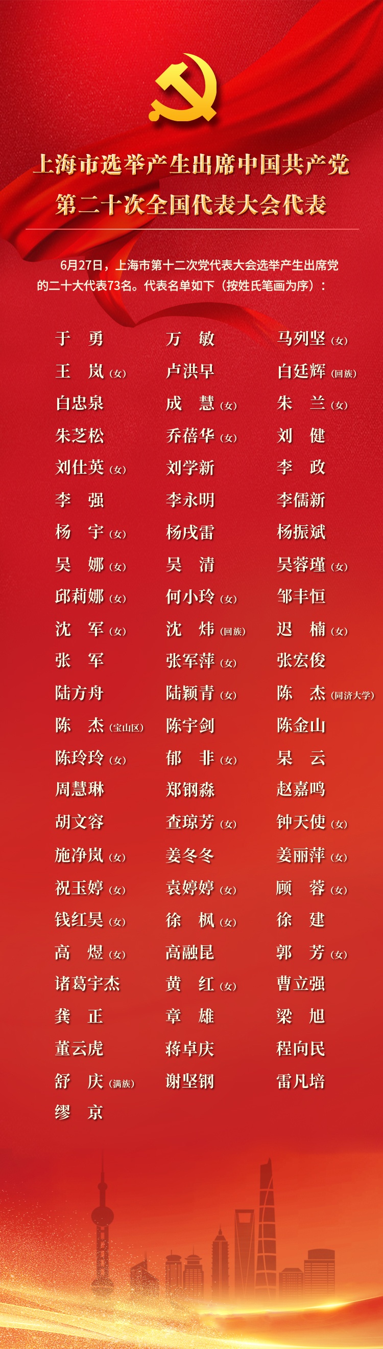 6月27日,上海市第十二次党代表大会选举产生出席党的二十大代表73名。代表名单如下(按姓氏笔画为序):