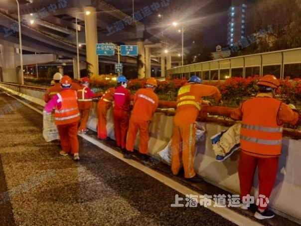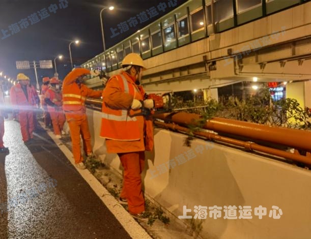 绿化工人会根据天气情况,定期或者不定期给高架悬挂绿化开展松土、除草工作,确保盆内无明显杂草,土壤不板结。由于高架车流量较大,这些养护作业一般都是利用高架夜间封闭养护时段开展,需要合理安排施工组织。
