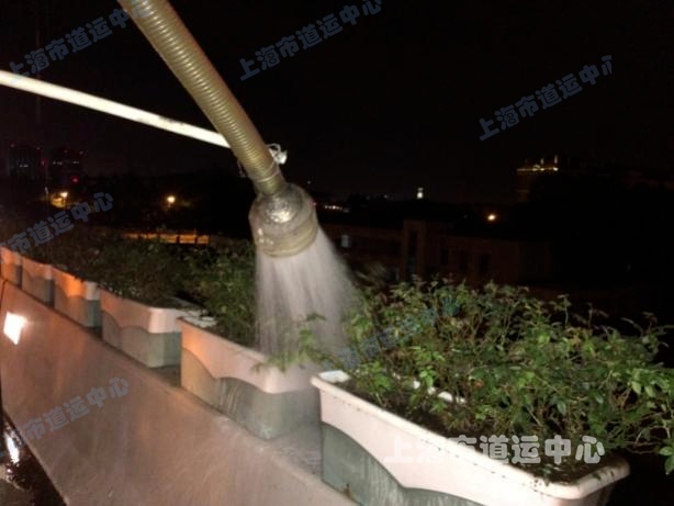浇水是绿化养护的首要作业内容。高架悬挂绿化由于特殊的放置环境,只能完全依赖于车辆机械作业,浇水的形式与路面清扫相似,即洒水车缓慢前行,洒水工在车后控制水管对绿化进行浇灌。浇水一般安排在车流量较少或者夜间封道养护时进行,作业时必须开启明显警示灯。