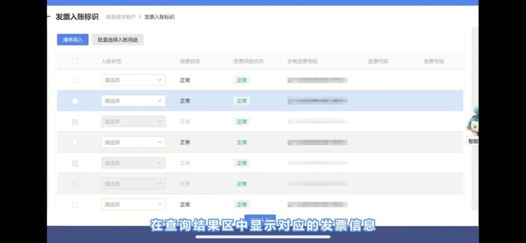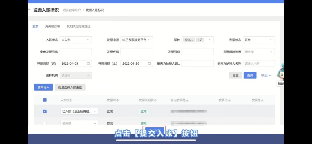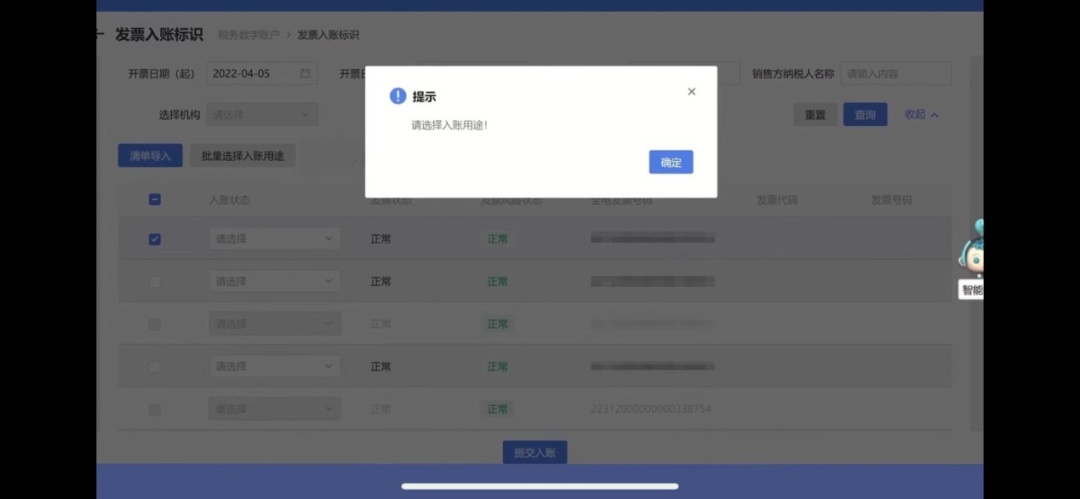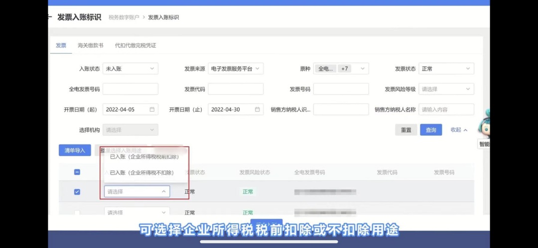 2.在查询到的对应发票信息中填写入账用途。可选择【企业所得税税前扣除】或【企业所得税不扣除】用途;