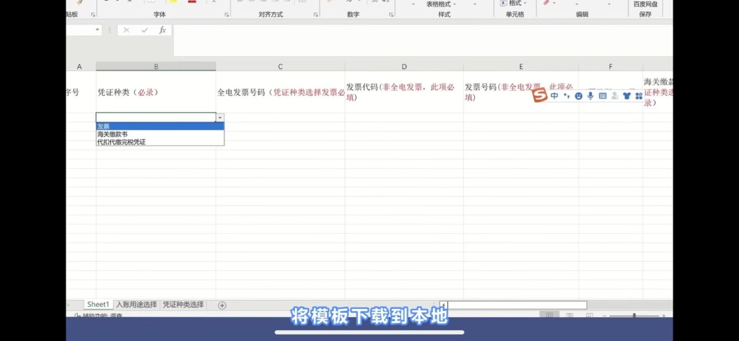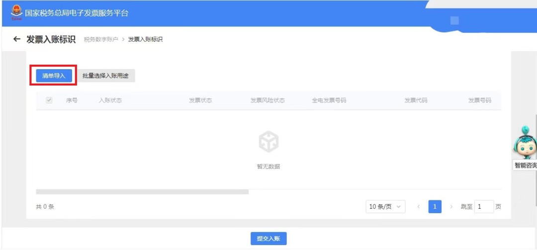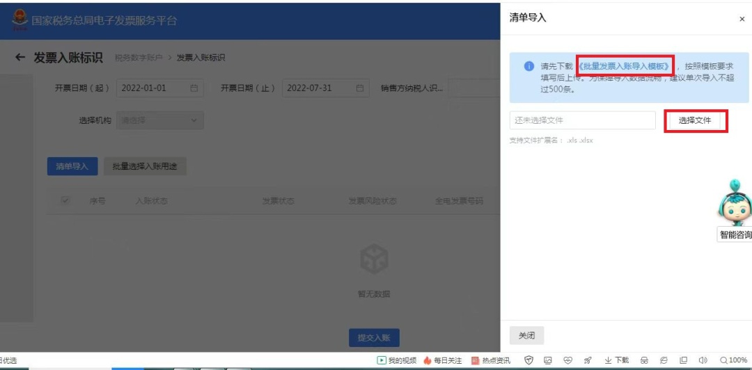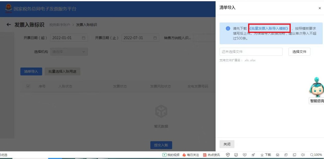 1.点击【清单导入】按钮,下载【批量发票入账导入模板】,将模板下载到本地。