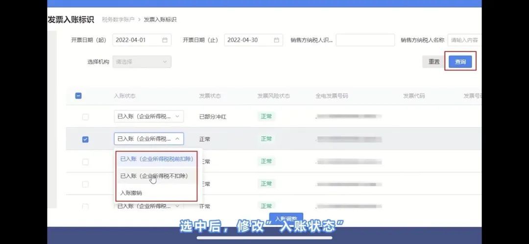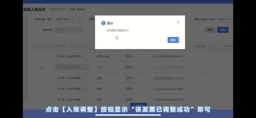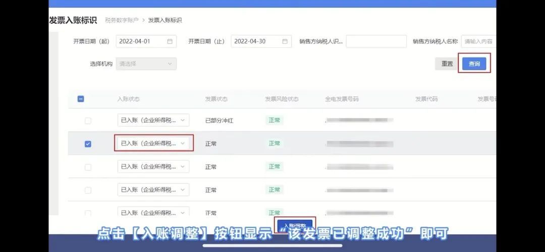 通过查询条件查询出已入账的发票信息,选中后,修改“入账状态”,点击【入账调整】按钮,显示“该发票已调整成功”即可。
