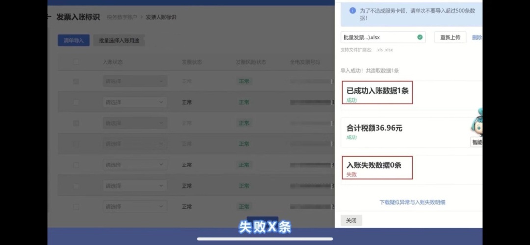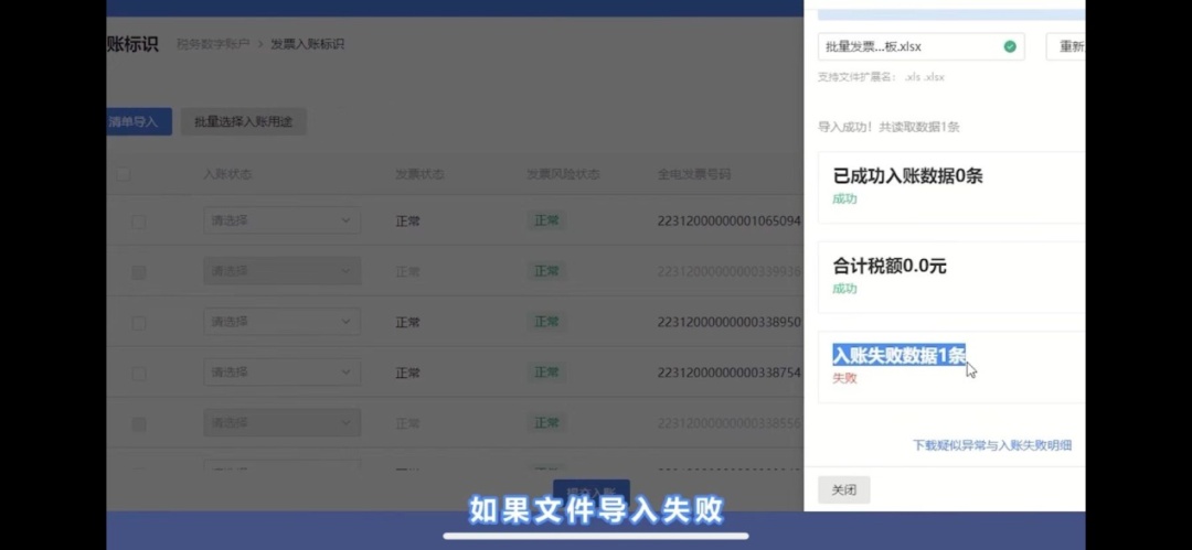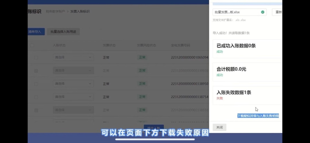4.如若文件导入失败,则会提示“入账失败数据X条”,可以在页面下方下载失败的原因,对填写的信息做相应的修改。