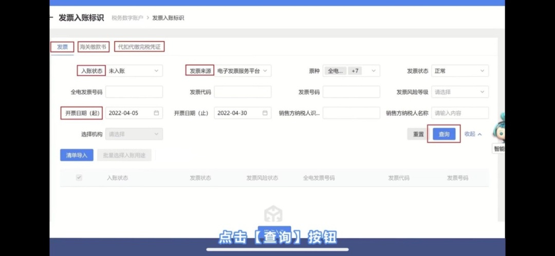 1.纳税人可根据需要选择发票、海关缴款书或代扣代缴完税凭证三种类型,选择【入账状态】、【发票来源】、【开票时间】等条件后,点击【查询】按钮,在查询结果区中显示对应的发票信息;