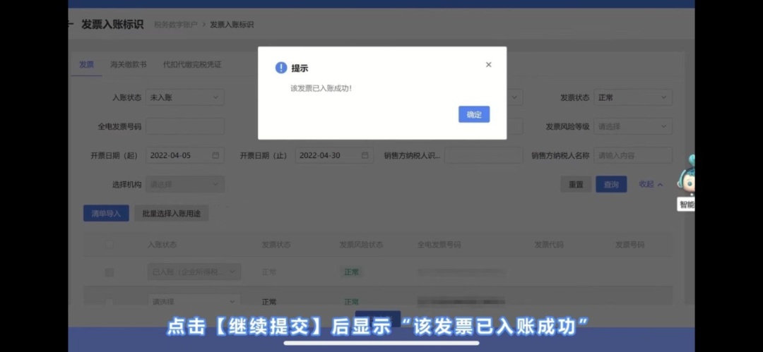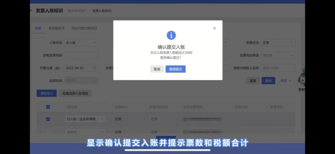 3.点击提交入账按钮。显示确认提交入账并提示票数和税额合计,点击【继续提交】后显示“该发票已入账成功”。
