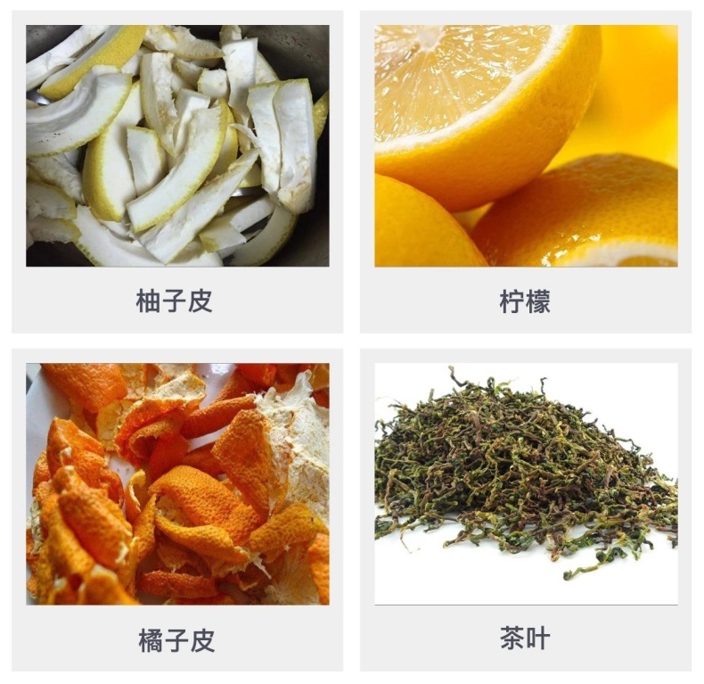 橘子、柚子、柠檬是家庭容易获取的材料,这些水果的果皮有不错的吸附能力,再加上本身果皮会散发淡淡的果香,所以一直是很多家庭的首选。另外,茶叶也有吸附异味的作用,但要注意,还要喝的茶叶切记密封储存后再放进冰箱,以免串味。