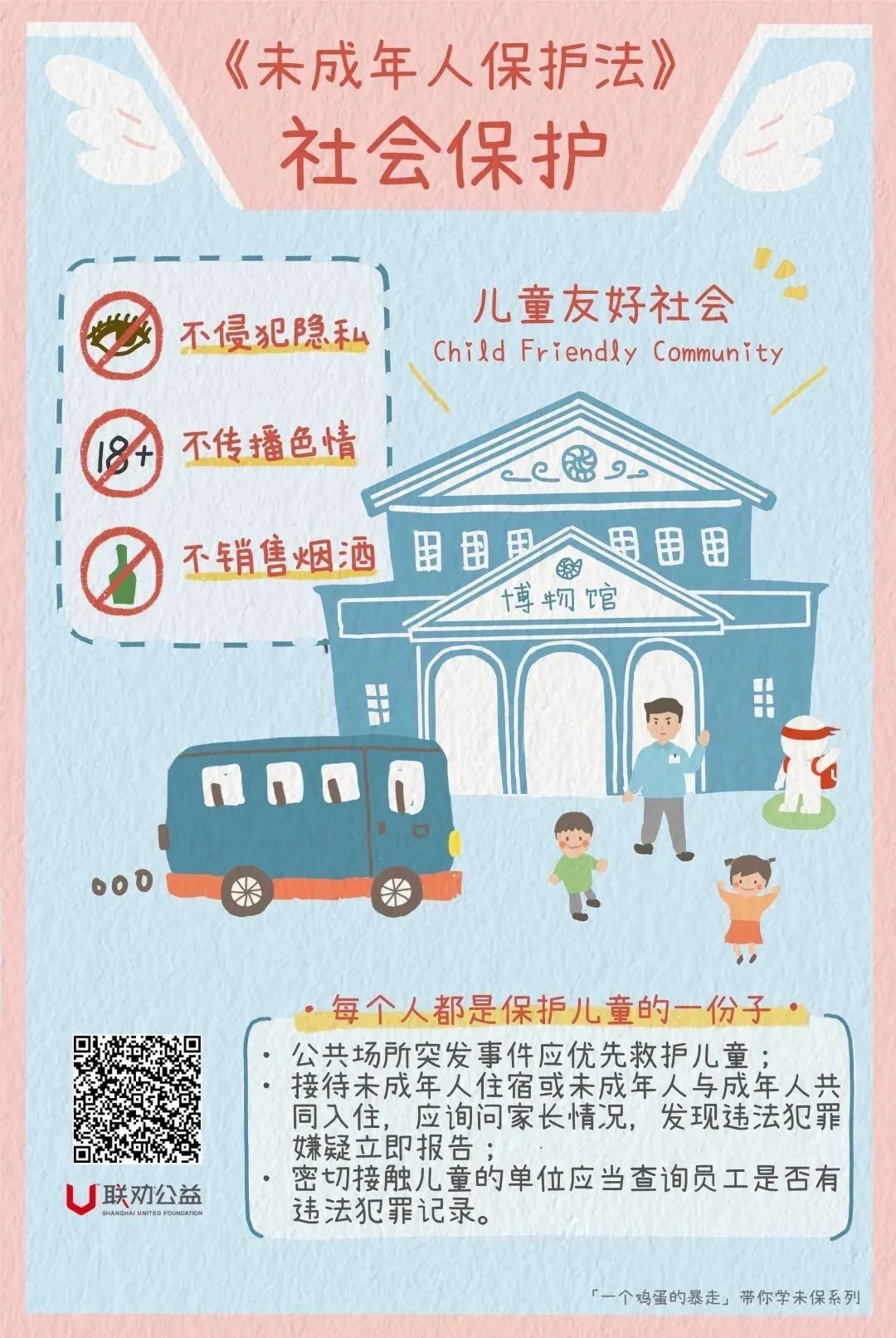 构建一个儿童友好社会,每个人都是保护儿童的一份子。全社会应当树立关心、爱护未成年人的良好风尚,“不侵犯隐私,不传播色情,不销售烟酒”。