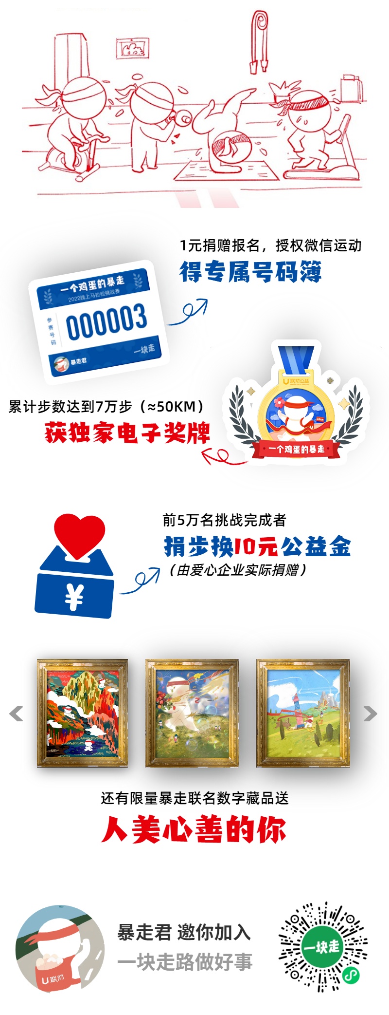 一个鸡蛋的暴走是上海联劝公益基金会于2011年发起的品牌公益项目,旨在通过12小时50公里的徒步筹款,支持与培育儿童公益项目,帮助0-18岁儿童健康快乐成长、平等发展。“一个鸡蛋的暴走”坚持快乐自主有成效的公益理念,让参与者实现个人挑战和公益参与的双重价值,让公益组织提升传播与服务的专业能力,让儿童在制度保障、专业服务与社会关爱中真正受益。