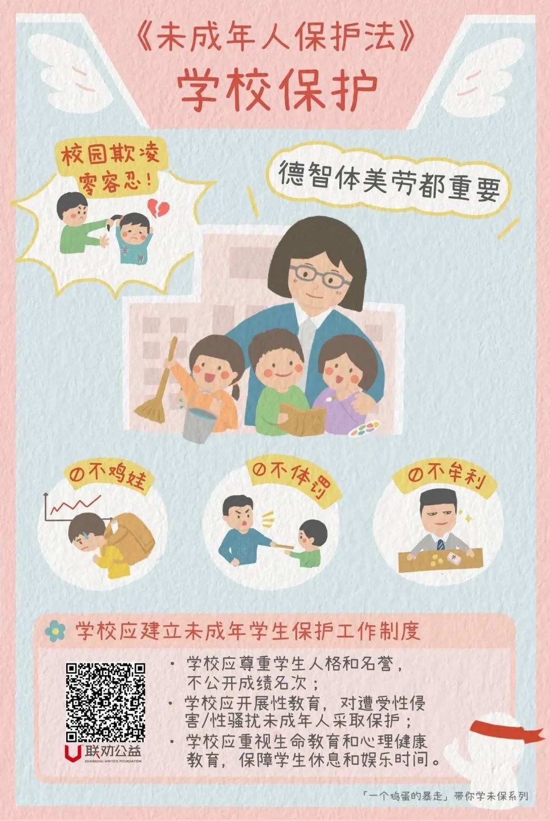 作为教育培养未成年人的重要场所,学校应建立未成年学生保护工作制度,做到“不鸡娃,不体罚,不牟利”。