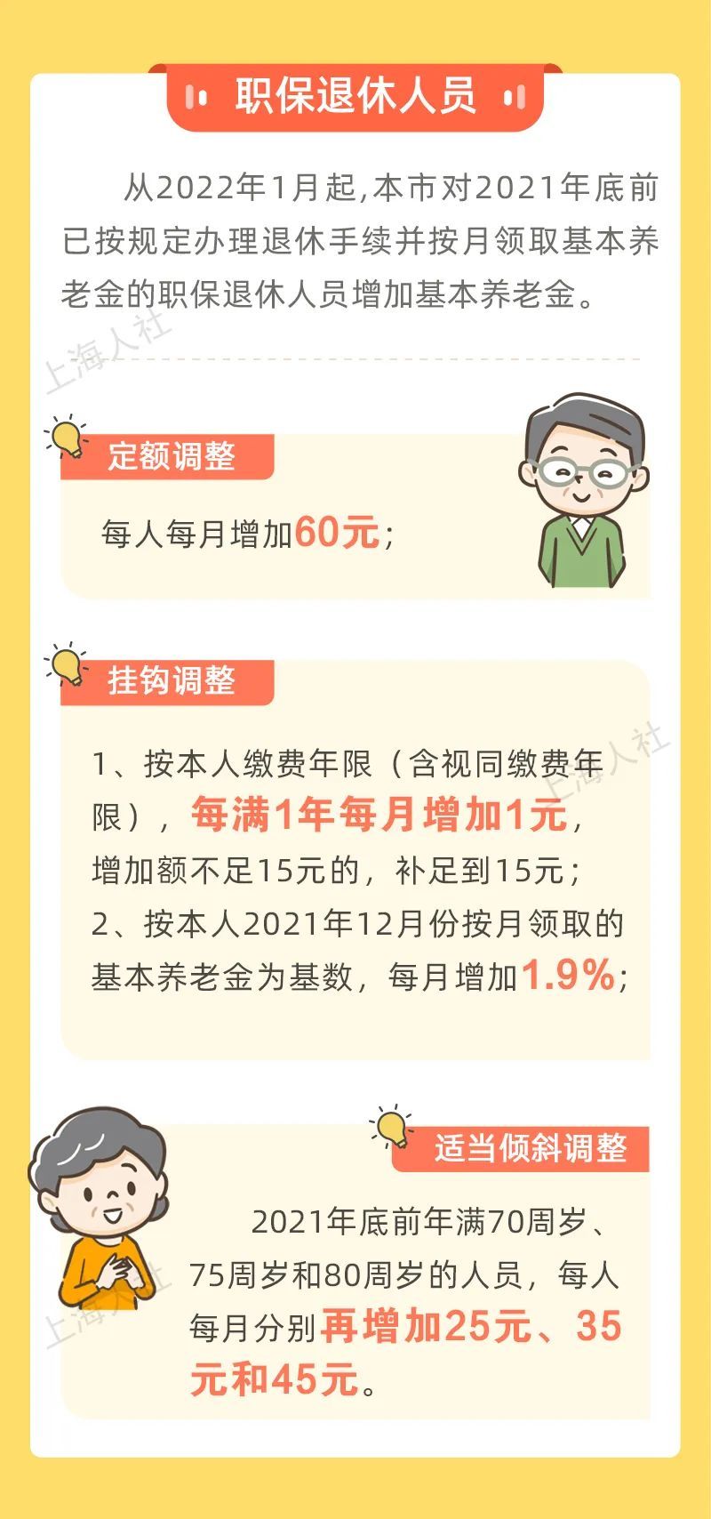 根据国家和本市有关规定,并经人力资源社会保障部、财政部批准,从2022年1月起,本市对2021年底前已按规定办理退休手续并按月领取基本养老金的职保退休人员增加基本养老金。企业和机关事业单位退休人员统一采用定额调整、挂钩调整和适当倾斜调整相结合的办法,具体为: