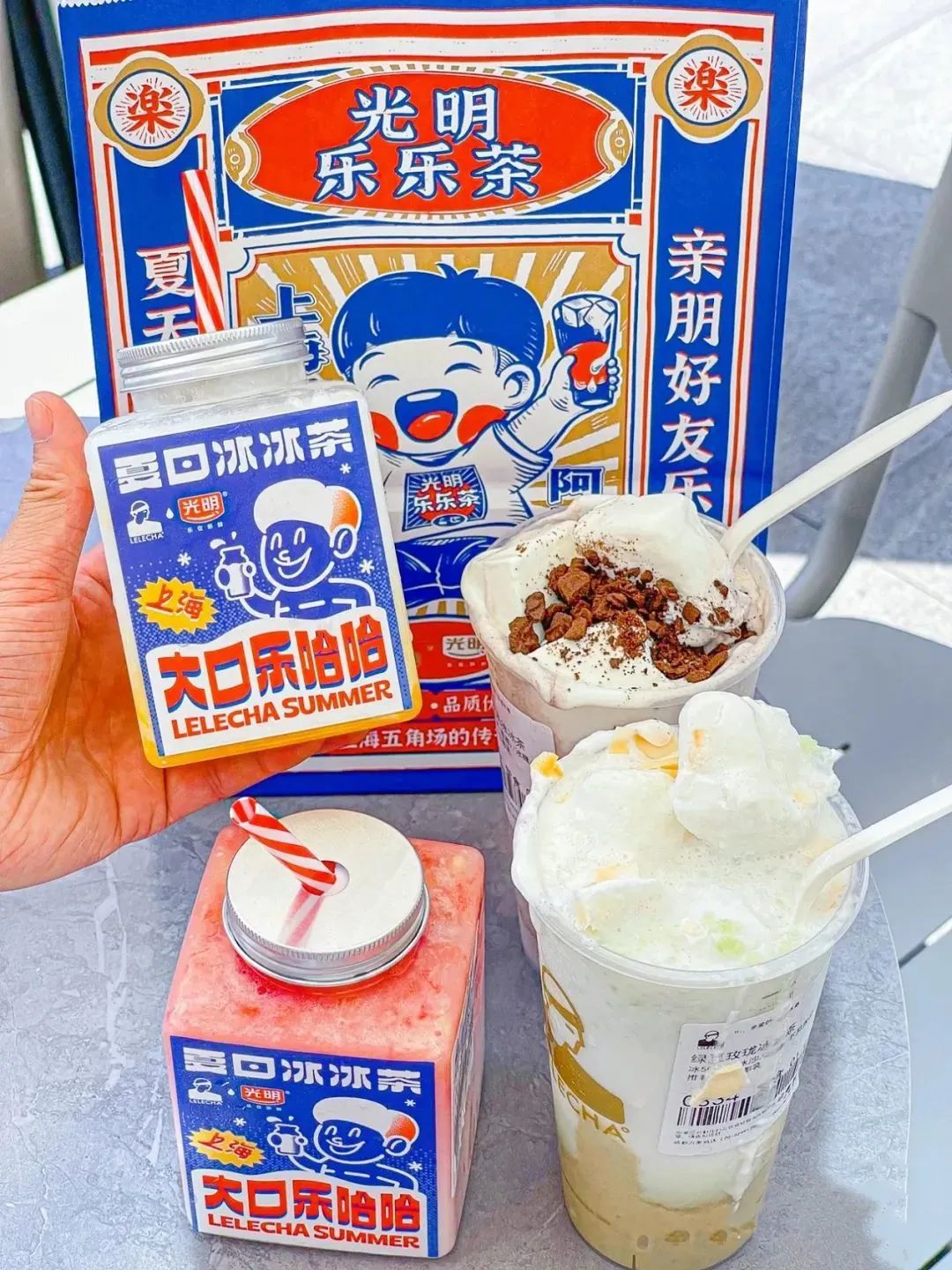 上海本土品牌乐乐茶则选择继续与光明联名推出了5款新品冰冰茶。新品均选用光明乳业旗下鲜牛奶和光明白雪冰砖作为原料,主打“上海怀旧味道”。其中,绿豆玫珑冰冰茶、西瓜生椰冰冰茶在社交平台的翻牌率更高,前者加入了夏日绝配绿豆沙,后者西瓜、椰子的搭配与方方正正的外形颇受欢迎。