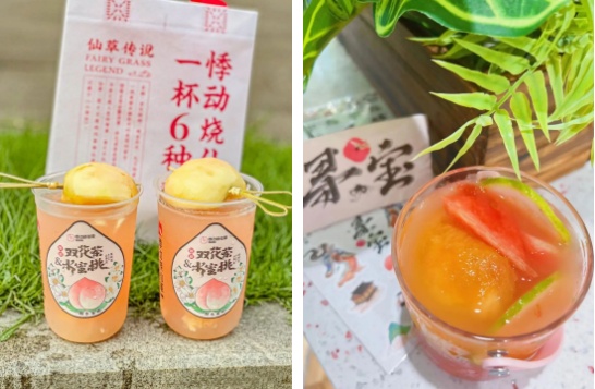 悸动烧仙草则与国家宝藏联名推出了三款中国风饮品。其中,在山茶花茶底加入了一整颗水蜜桃,一半蜜桃果肉放置杯顶,十分吸睛。