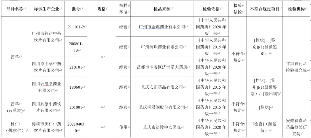 经甘肃省药品检验研究院检验,标示为广州市伟达中药饮片有限公司、四川原上草中药饮片有限公司、四川云亳堂药业有限公司生产的4批次茜草不符合规定,不符合规定项目包括性状、显微鉴别、浸出物;标示为四川欣康中药饮片有限公司生产的1批次茜草(茜草炭)不符合规定,不符合规定项目为性状。