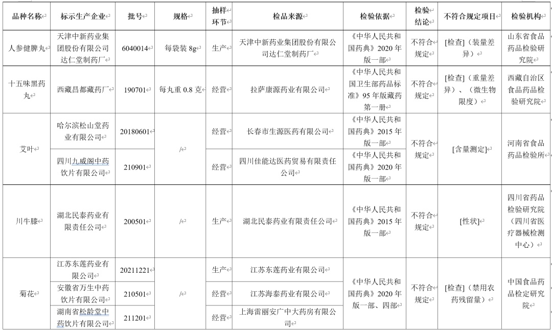 经中国食品药品检定研究院检验,标示为江苏东莲药业有限公司、安徽省万生中药饮片有限公司、湖南省松龄堂中药饮片有限公司生产的3批次菊花不符合规定,不符合规定项目均为禁用农药残留量。