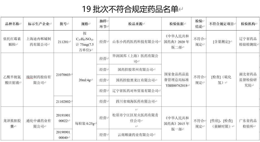 国家药监局今日发布通告,经湖北省药品监督检验研究院等10家药品检验机构检验,标示为瑞阳制药股份有限公司等16家企业生产的乙酰半胱氨酸注射液等19批次药品不符合规定。