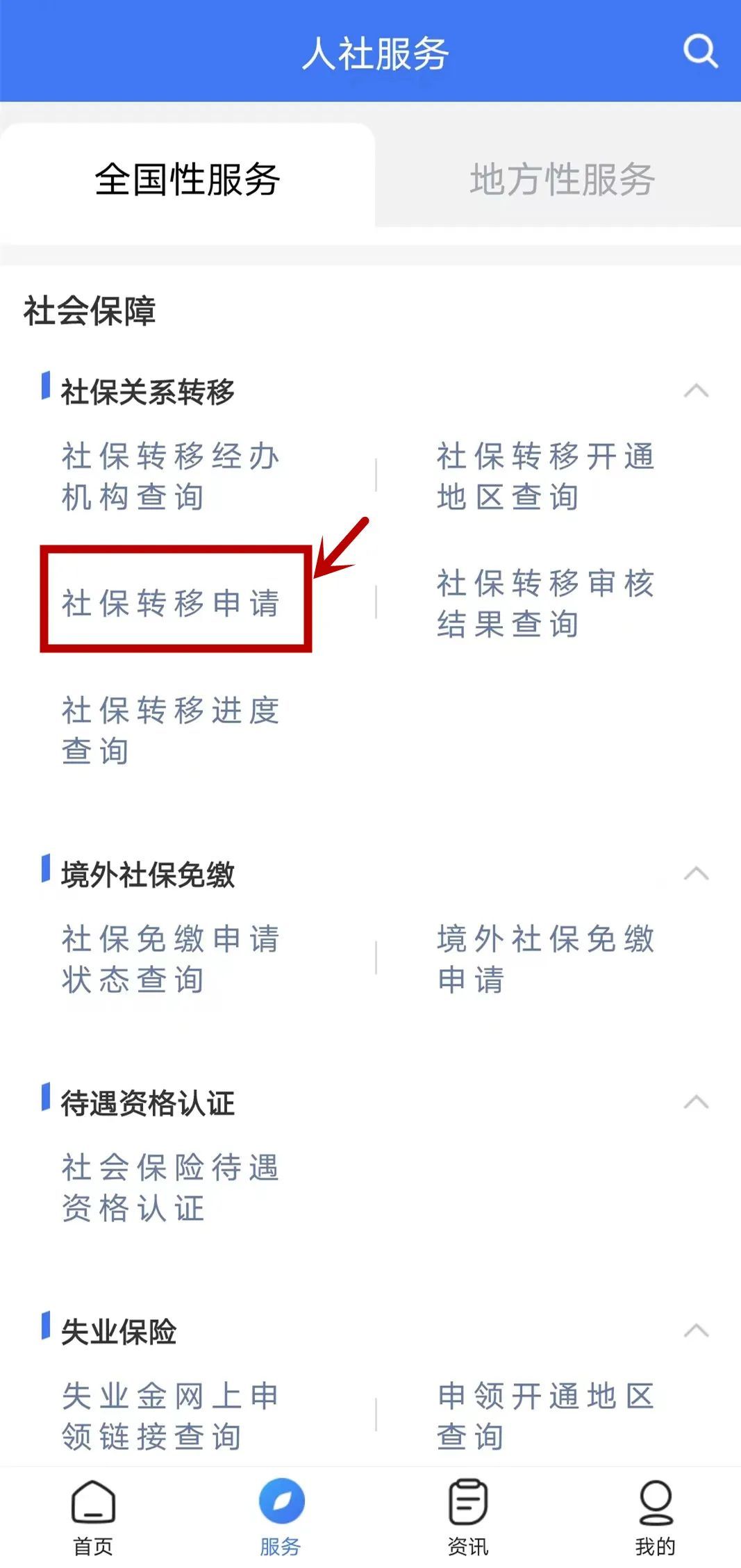 找到“社保转移申请”点击进入,如下图: