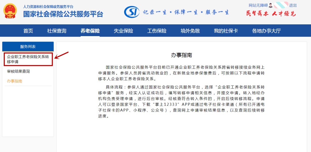 进入国家社会保险公共服务平台(http://si.12333.gov.cn),通过个人信息登录后,在首页中,选择“关系转移”栏目中的“养老保险关系转移申请”进行办理,如下图: