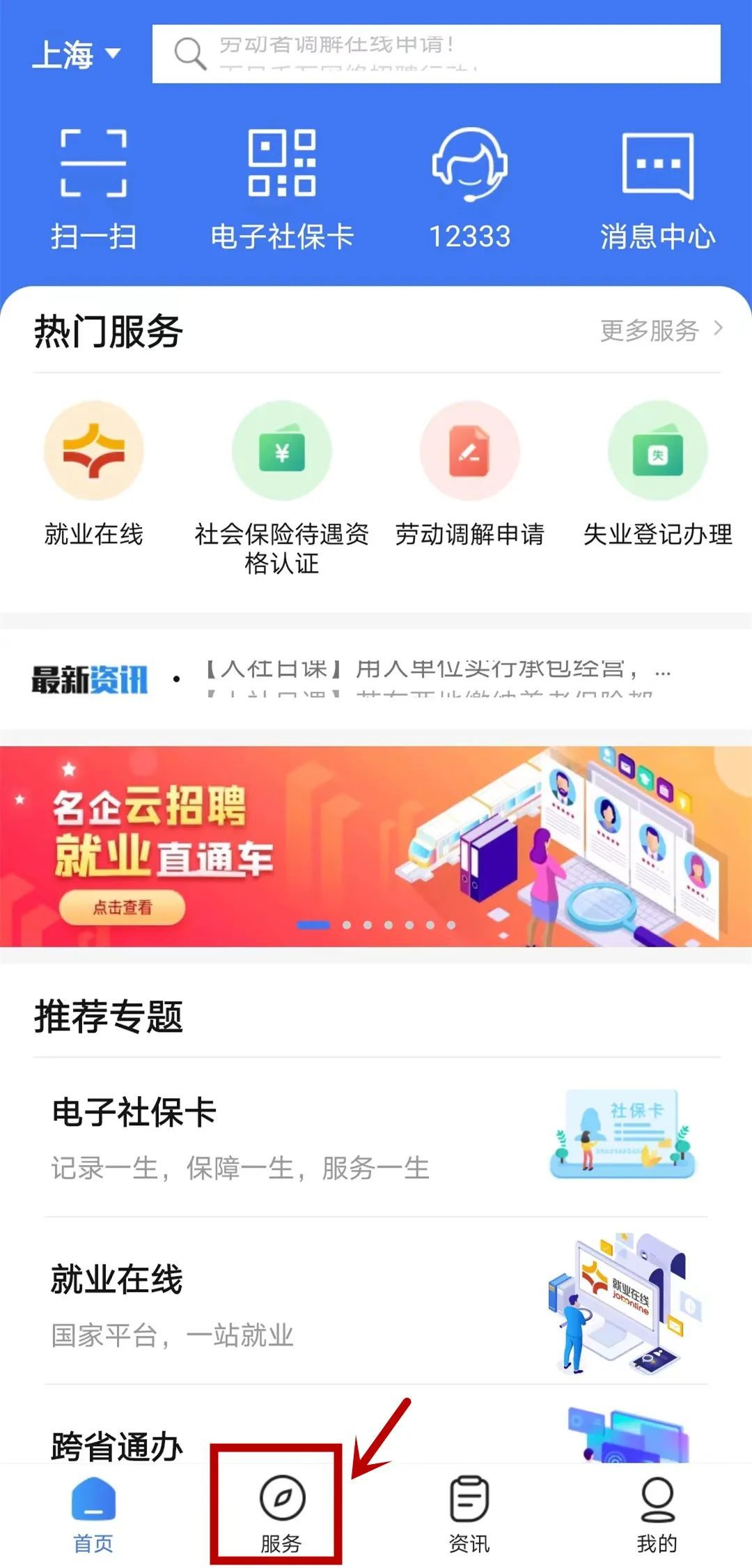 打开“掌上12333”APP,登录后点击下方的“服务”按钮,如下图: