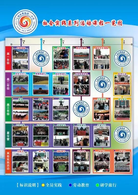 “通过接触社会、了解社会、研究社会、服务社会,才能成为真正意义上的社会人,否则就是温室里的花朵,书斋里的孩子。”多年来,曹杨二中探索形成了一系列精品实践活动课程,包括 “重走大师路”江村社会实践考察、 “博雅西部行”、银行考察等项目,从高一的军训、南京生存训练,高二的学农、筑梦计划,到高三的宣誓明志、成人仪式……二中学子社会实践的足迹遍及17个省市,他们也获得了“生理、知识、心理”三个层面的成长。