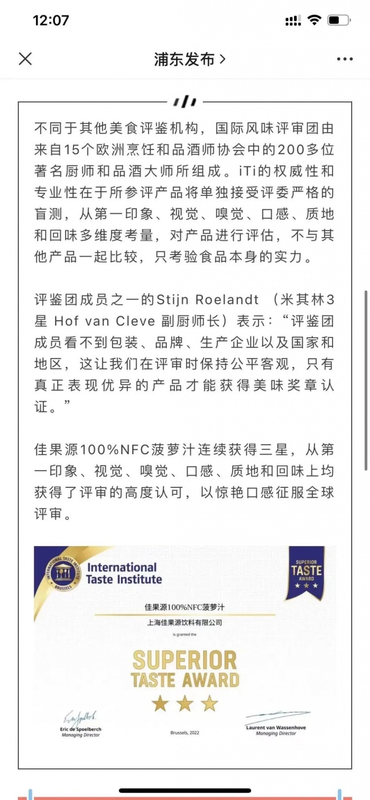 在全球各类优异产品的激烈角逐中,国内高端纯果汁品牌佳果源连续三年获得“三星”奖而摘得珍稀的iTi国际美味奖章“水晶奖”。这不仅是佳果源品牌连续参评国际美味奖章以来获得的最高奖项,同时也是中国果汁品牌首摘该殊荣。