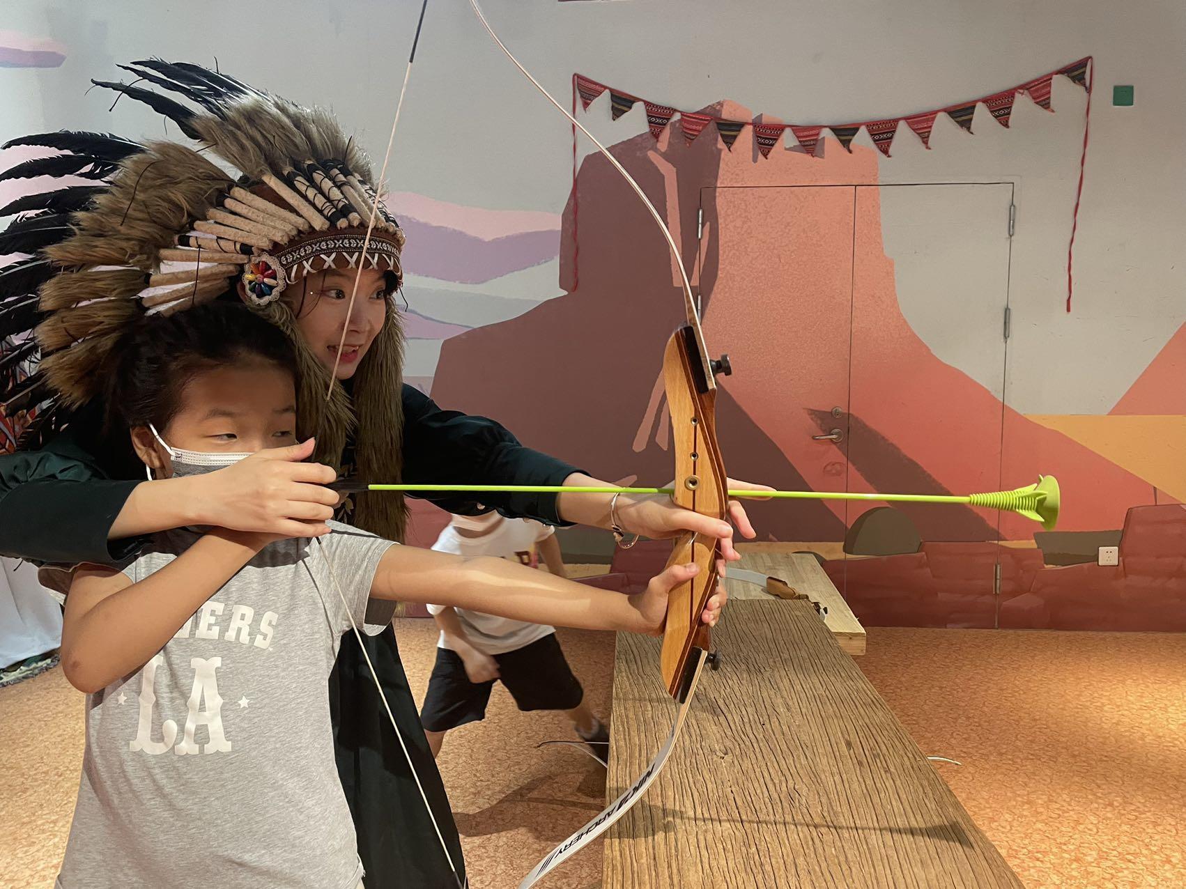 枪战还不过瘾,还能去印第安部落,带上传统头饰,体验射箭的乐趣。