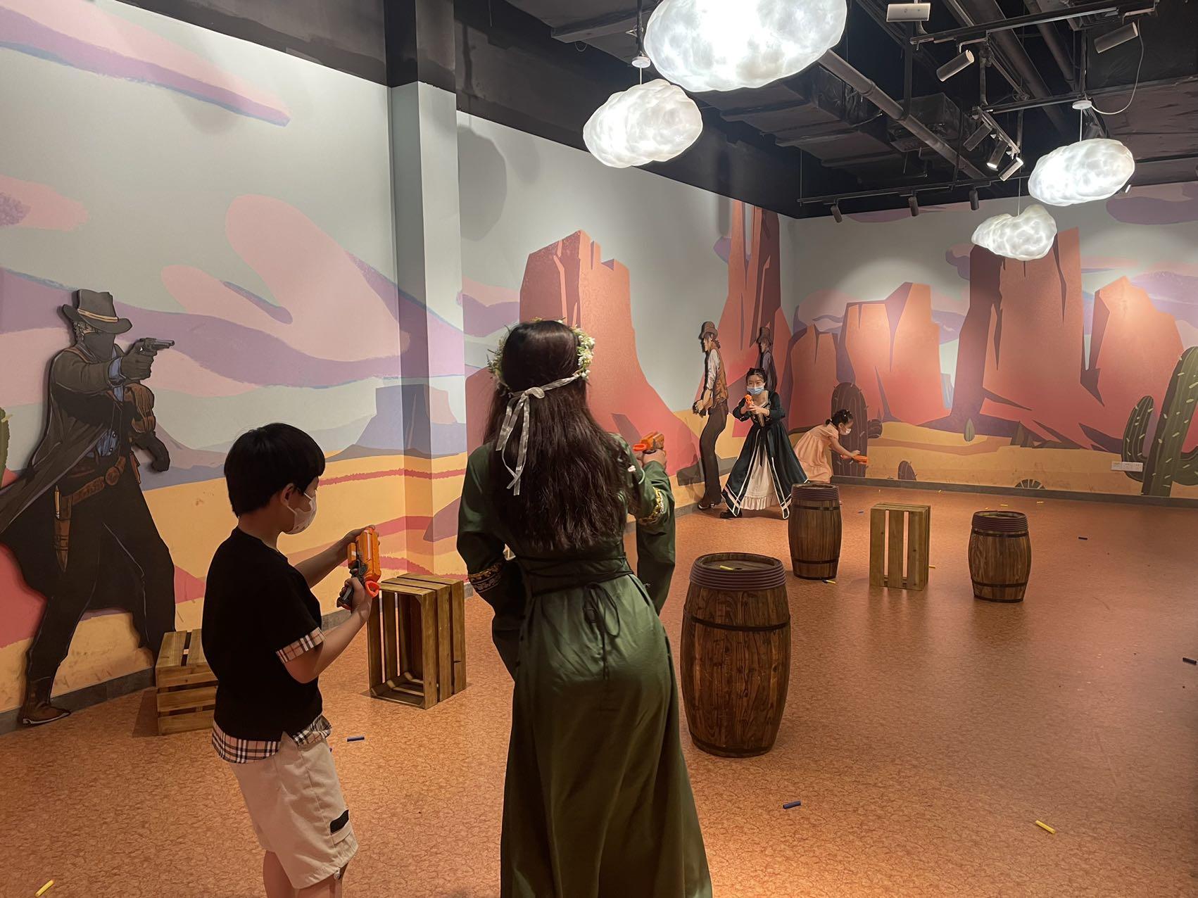 根据不同场景设置,融入了相应的体验活动。走进知名西部电影《黄金三镖客》中的老克里酒吧,孩子和家长可以拿起发射海棉弹的手枪,体验一场激烈的西部枪战。