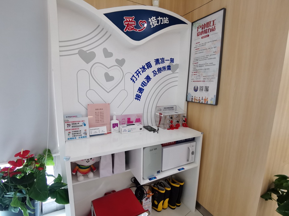 站点位于金珠路近红宝石路的中国电信营业厅,站点内除了工会提供的常规用品,营业厅还为户外职工贴心地准备了消毒液、医用手套等防疫物资。如有更多需求可咨询大厅工作人员。