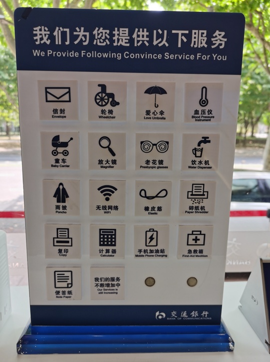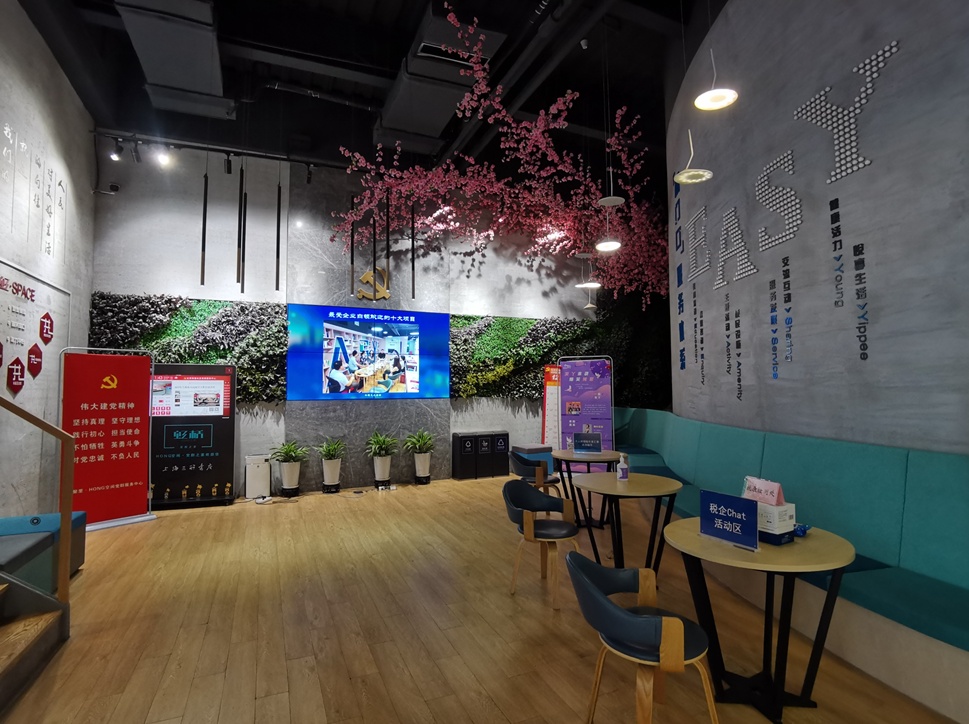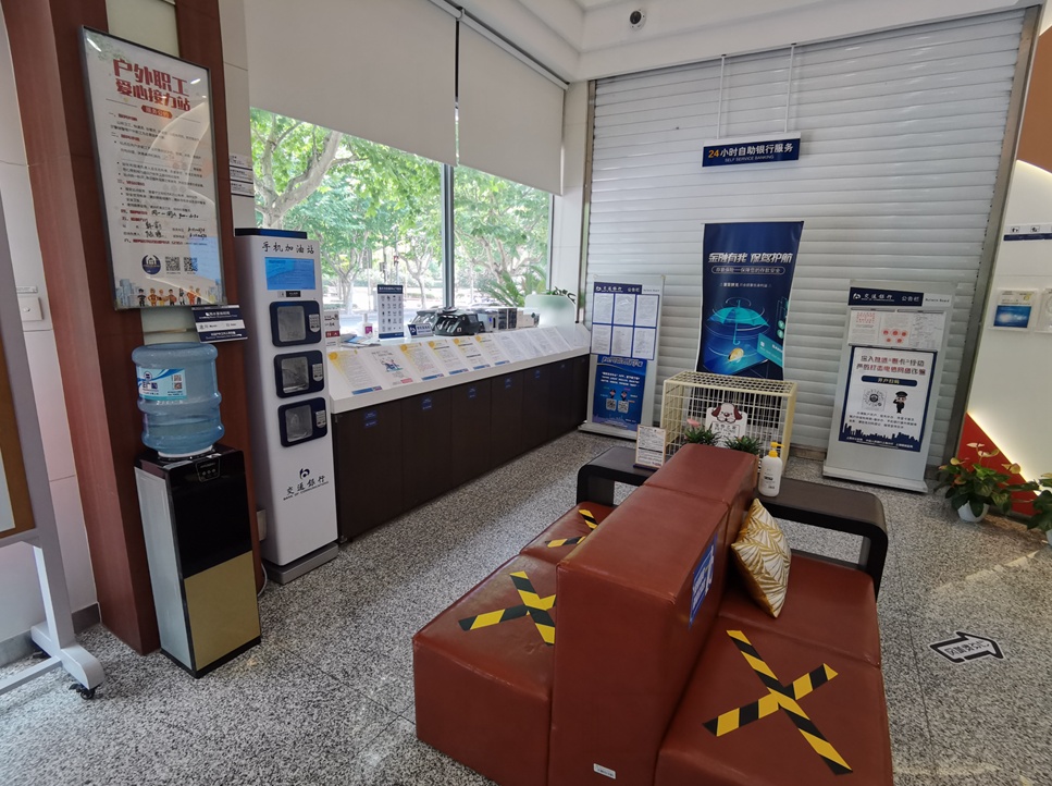 站点位于伊犁南路与黄金城道交叉口的交通银行上海黄金城道支行一楼服务大厅内,饮水机、手机加油站、防疫用品等常规物资在大厅的休息区整齐摆放。服务台上的提示牌标注了站点可提供的各种服务,如有更多需求可以咨询大堂经理。据工作人员介绍,站点的服务会根据职工的需求不断地进行升级和完善。