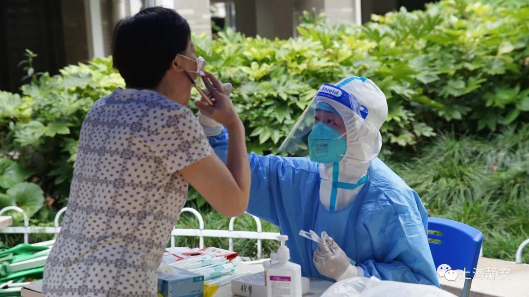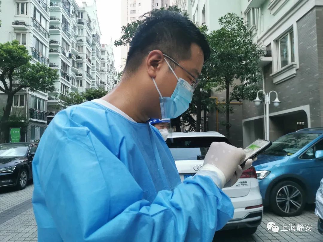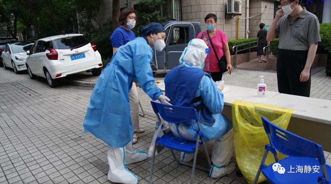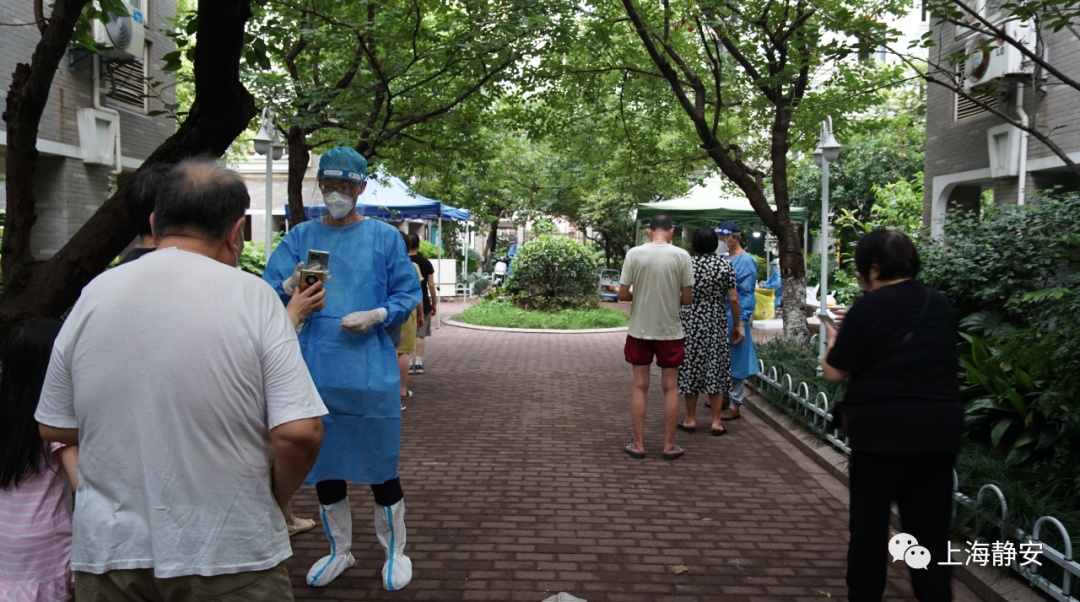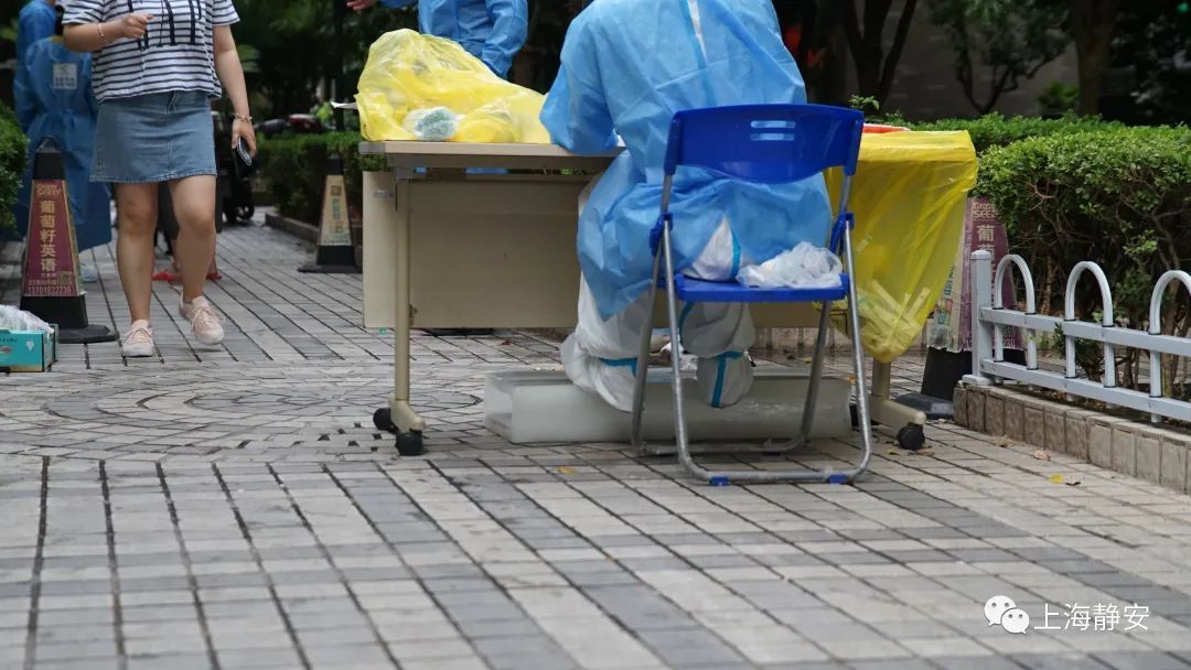 15日傍晚6点,来自石门二路街道社区卫生服务中心的医务人员准时开始为新福康里居民区的2000余名居民采样。尽管已是傍晚时分,经过一整天烈日暴晒的地面余温尚存,空气中仍弥漫着阵阵热气。