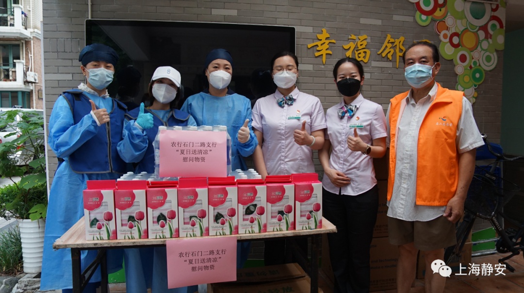 当天,作为新福康里的社区共建单位,中国农业银行石门二路支行还贴心地给居委会送来了盐汽水、毛巾等降暑慰问物资。