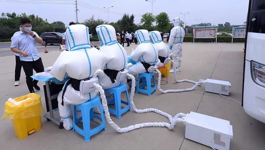 另外,还有些“大白”的防护服充了气,鼓鼓囊囊的。走近一看,防护服的后颈处有一个管道口,通过一根空调管道,与后背背着的白色“空调机”相连,源源不断的冷风通过管道输送到衣服内部,让衣服“膨胀”起来,医务人员可手动调节风速大小,既方便又人性化。