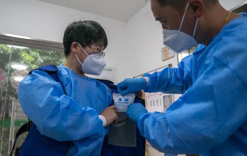 核酸采样人员穿着蓝色的“冰马甲”在采样