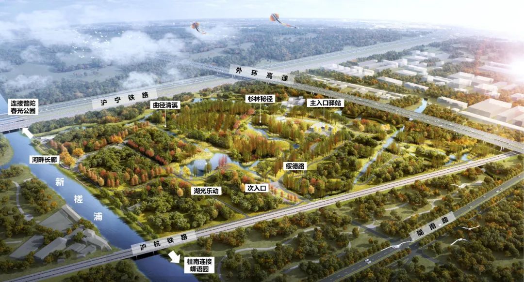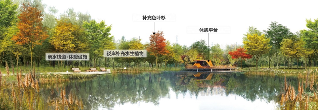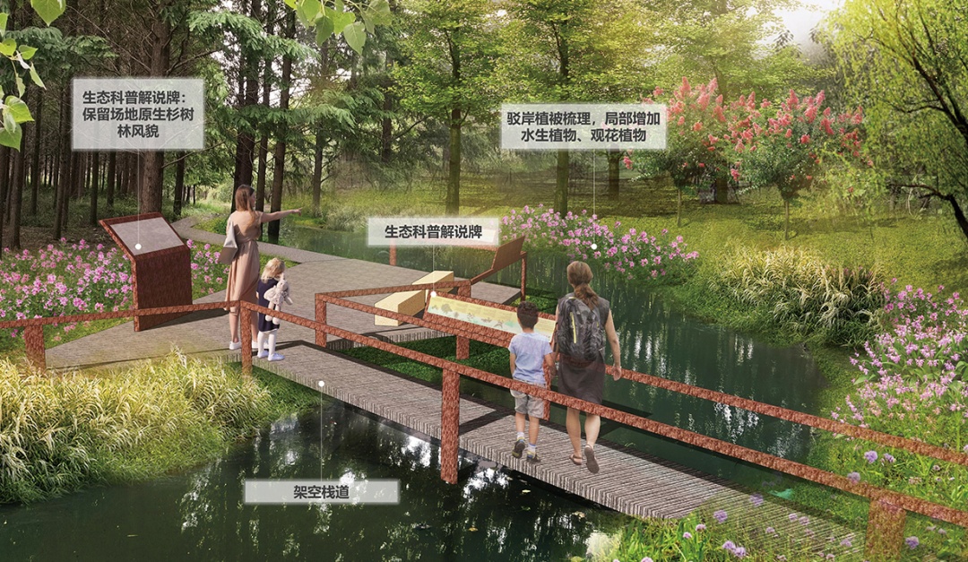 根据设计方案,绥德公园将被打造成以水生林地体验和湿地生态教育为主的森林湿地型公园,保留林地原生风貌,为游客提供“公园+森林游憩”体验。公园秉承水系与绿道贯通的设计理念,形成“一环、一廊、三点”的整体架构。