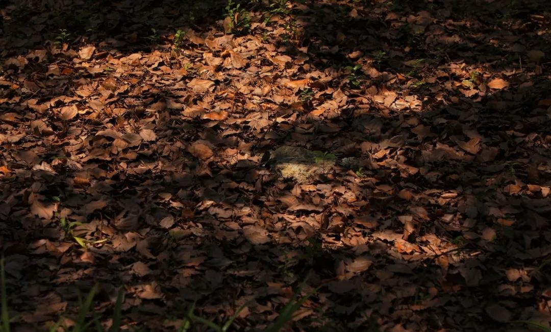 投射在落满树叶的地面上