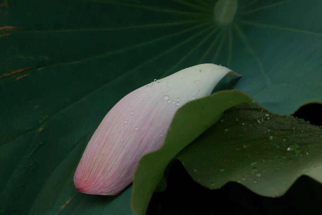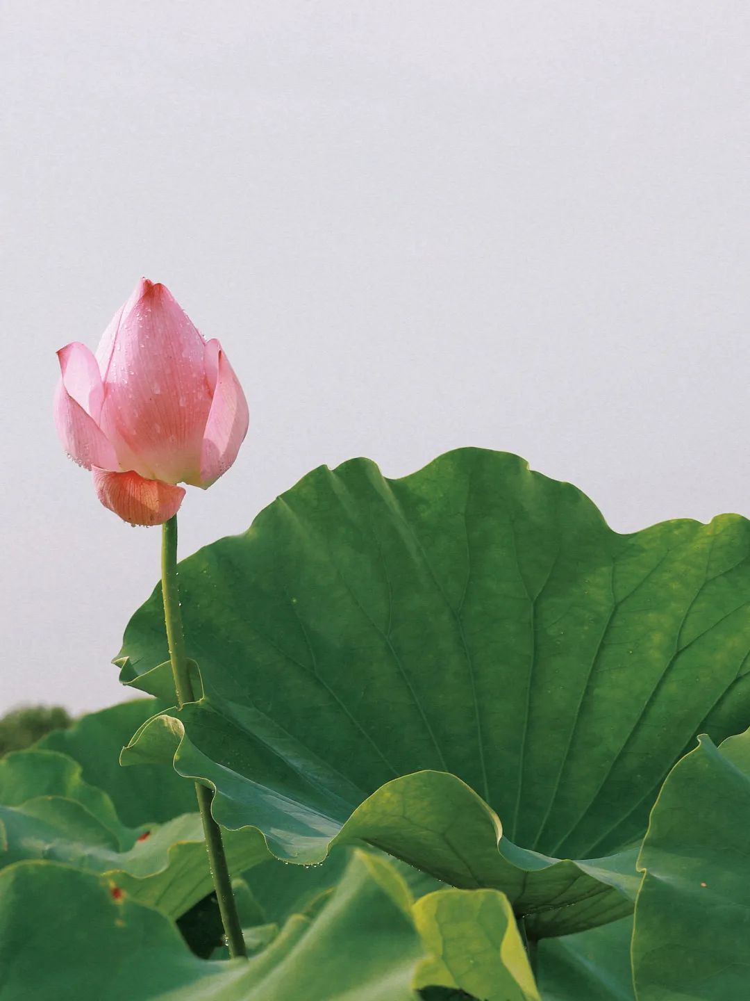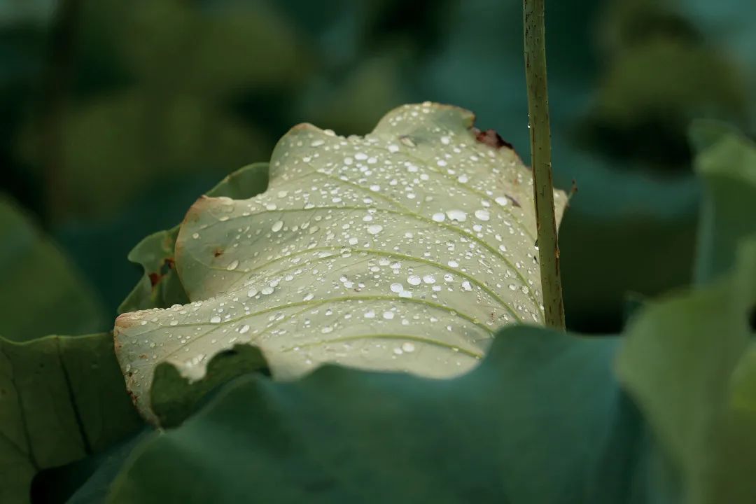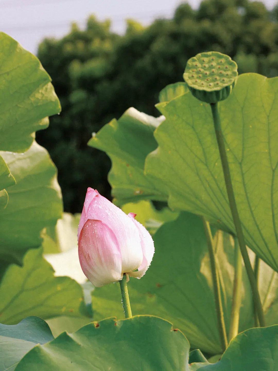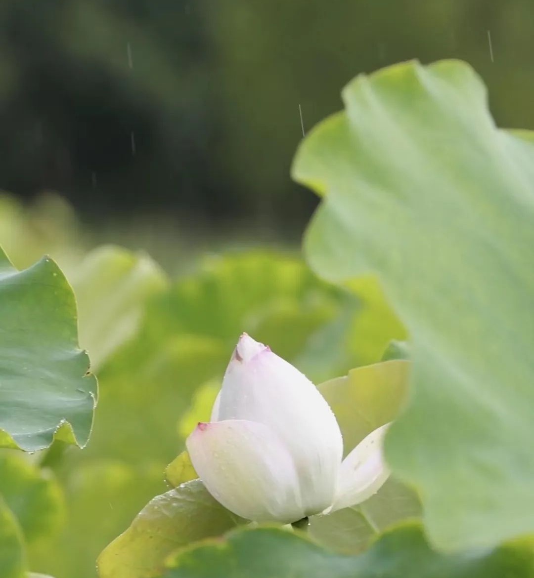 整片的荷塘里,盛放的荷花宛如池中仙子,亭亭玉立令人流连忘返。雨后的荷花没有晴天时候那样娉婷舒展,大部分都紧紧收成一朵朵花蕾,静静依偎在碧绿滚圆的荷叶中,在柔软的雨丝沐浴下,更显清秀、俏皮。