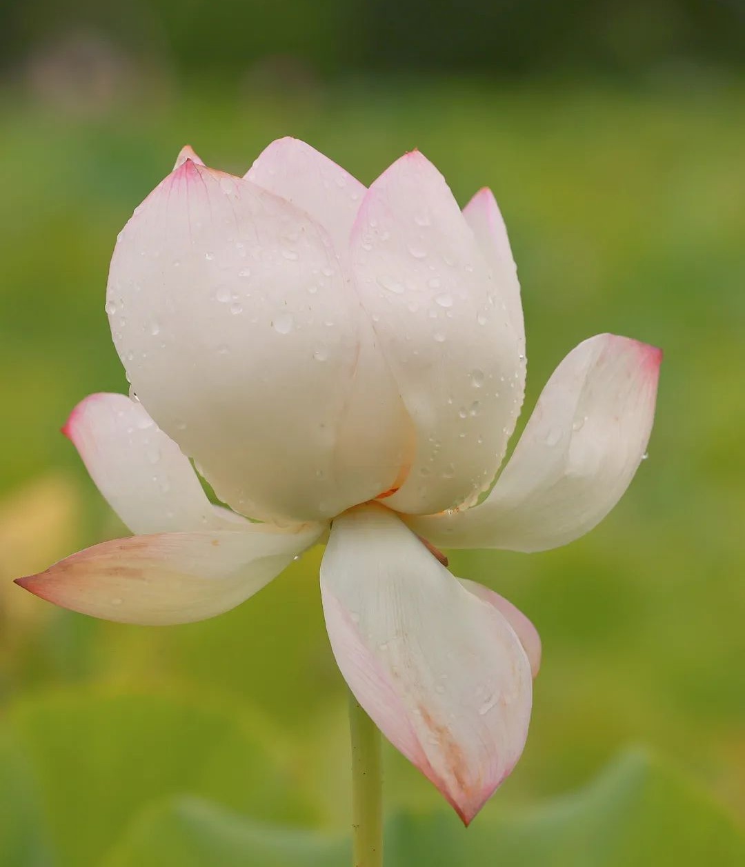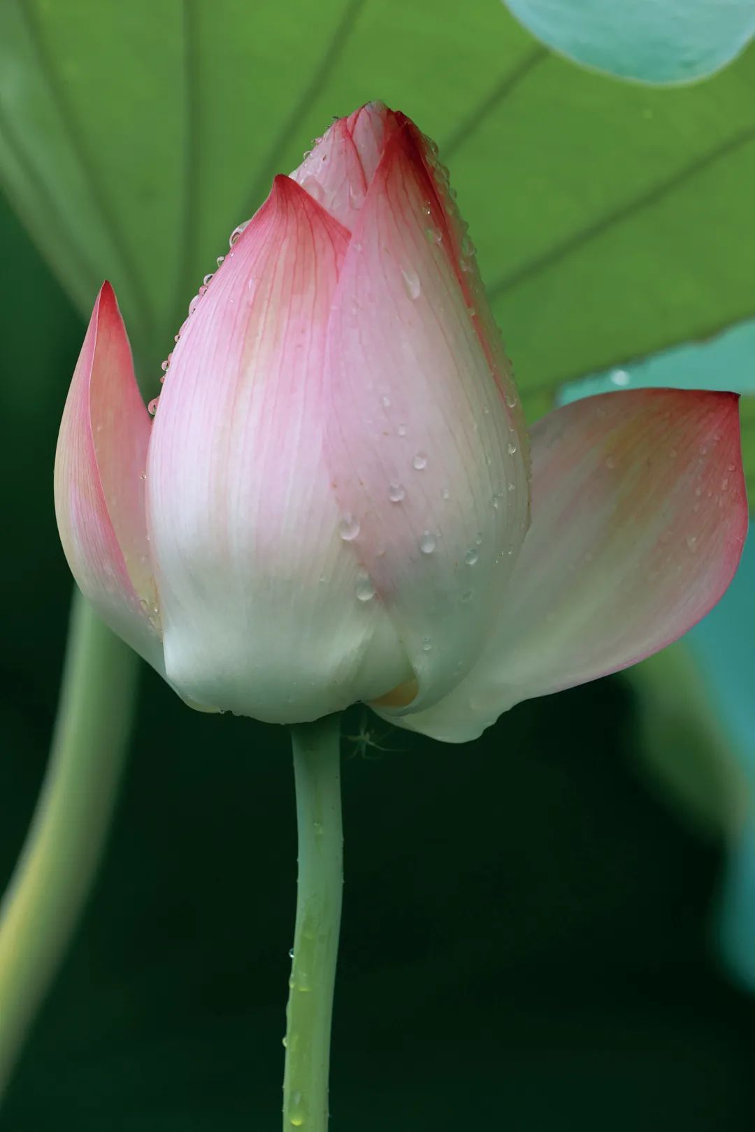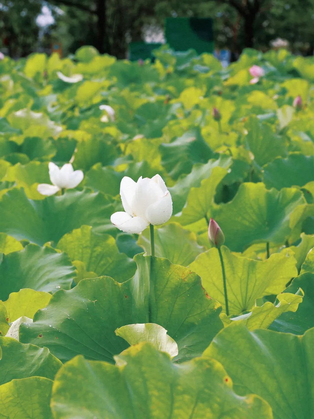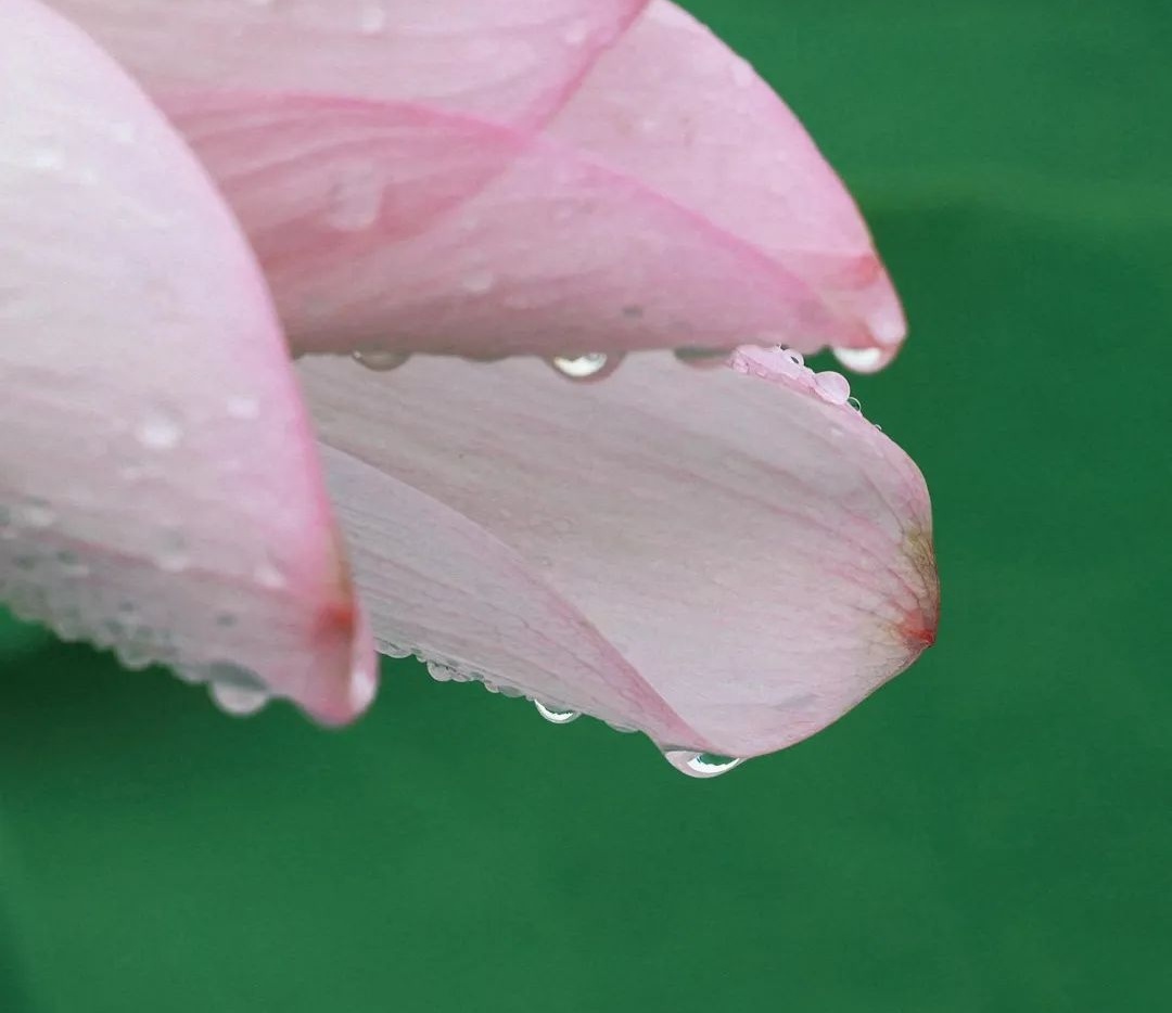 整片的荷塘里,盛放的荷花宛如池中仙子,亭亭玉立令人流连忘返。雨后的荷花没有晴天时候那样娉婷舒展,大部分都紧紧收成一朵朵花蕾,静静依偎在碧绿滚圆的荷叶中,在柔软的雨丝沐浴下,更显清秀、俏皮。