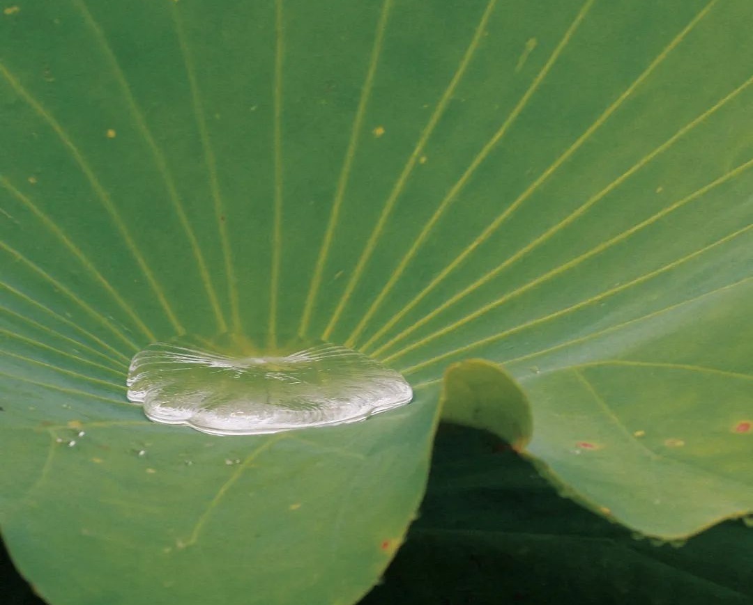 一阵微风掠过,碧绿的大叶盘上一滴滴晶莹透亮的小水珠珍珠似的滚来滚去,忽而东,忽而西,忽而又滚落进荷塘里消失不见。