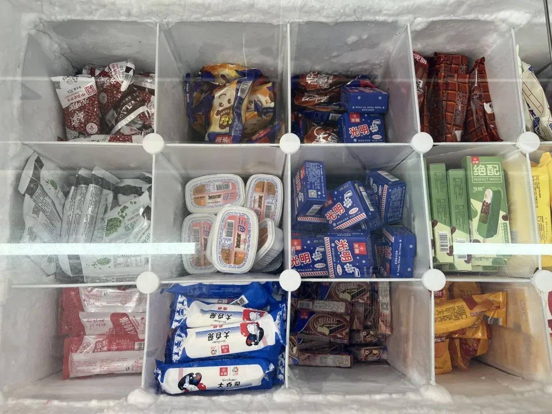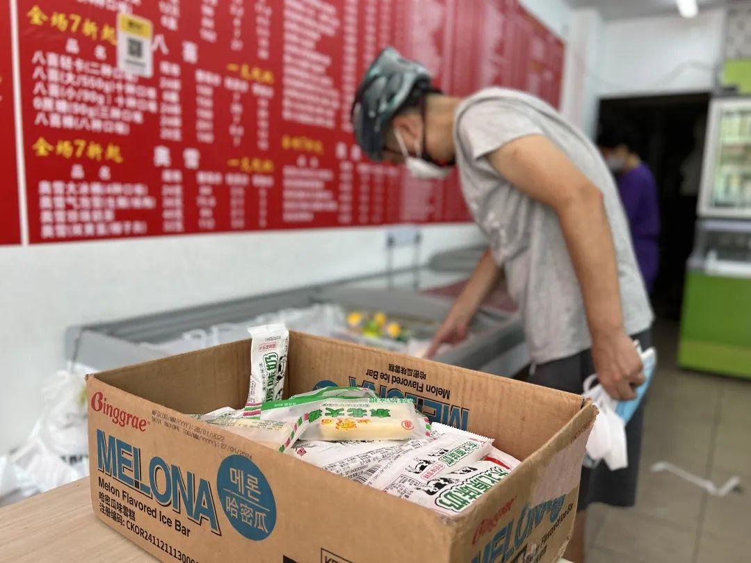 市民王阿姨和老伴儿穿梭在各个冷柜之间,不一会儿就装满了两大纸箱,赤豆棒冰、三色杯、雪宝,品种多样。王阿姨说,“加起来一共买了两大纸箱,全家一起吃,大概能吃个两周时间,之后会再来囤了。”