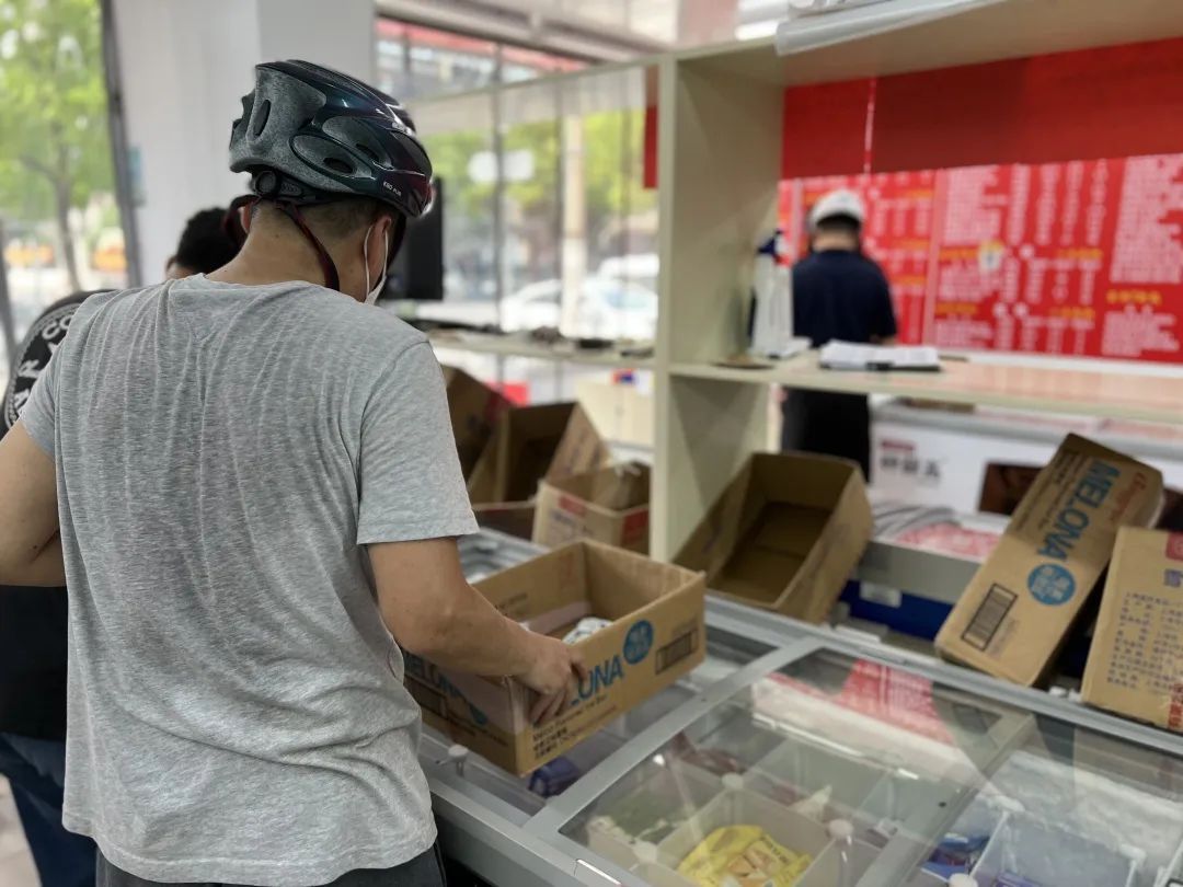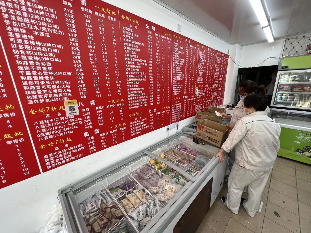 顾客忙着挑选喜爱的冷饮口味,而店长赵学宽手上动作也没停过。他说,批发站自6月1日恢复营业后,每天5名工作人员全程在线,光补货就同时需要两个人。