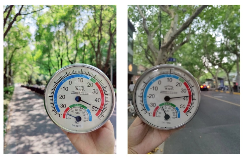 记者亲测,正午时分,完全无遮挡的路面,温度计显示超过47℃,差点“爆表”;而同一时段,林荫道的温度为37℃左右,温差近10℃!