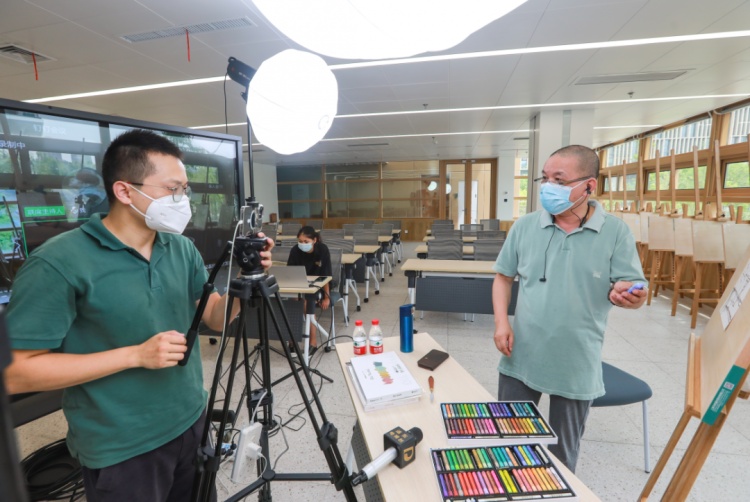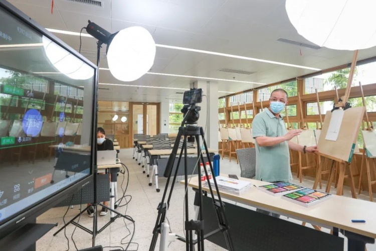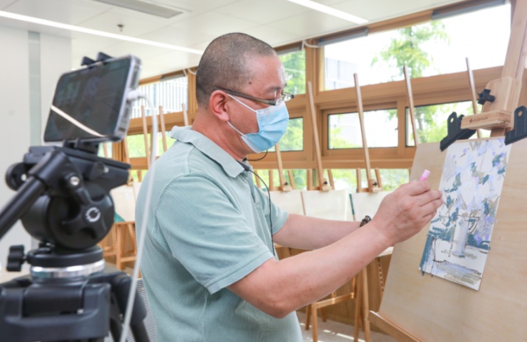 “近点、再近点,可以了,这样就看得清楚了……下次就这样。”油画课直播开始后,教室里的几名工作人员,依然在紧张地寻找手机摆放的最佳角度,直至“怼”到了画架前。慢慢地,画纸上的轮廓逐渐清晰:一朵插在瓶中的花,通过网络传输,出现在手机另一头的十余名学员们眼前。