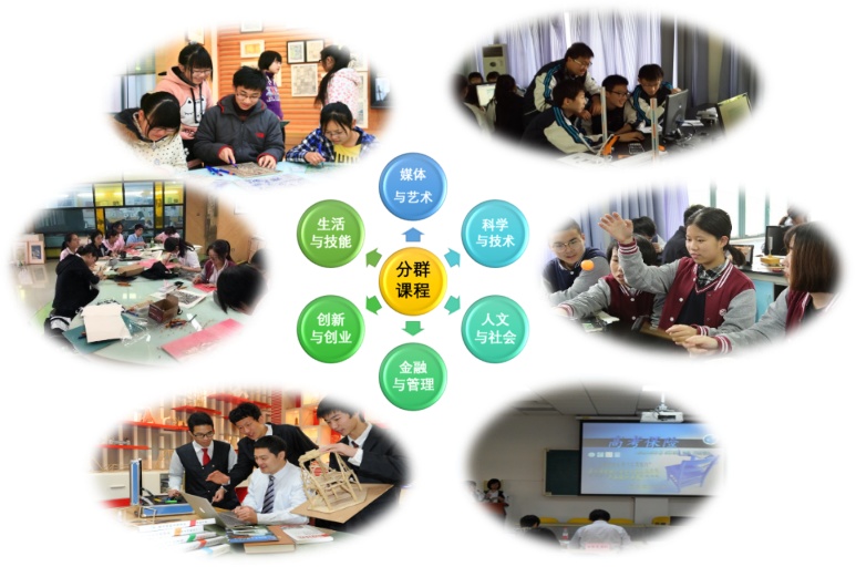 “因能分层”课程针对学生知识和技能水平的差异需求,对语、数、英或“加三”等科目内容进行分层设置,根据课程难度分为基础、综合和创造三个水平层次。“因志分类”课程针对学生生涯志向的差异需求,依据高考综合改革要求,结合生涯规划指导和学生自身志向,自主选定课程组合,课程包含高考选科组合课程、拓展型和研究型课程及社会实践课程。“因趣分群”课程针对学生兴趣爱好的差异需求,设立“科学与技术、人文与社会、媒体与艺术、金融与管理、创新与创业、生活与技能”六大跨学科课程群,包含“科创课程”“体艺劳专项课”“社团课程”“大师课程”等多个特色课程,旨在充分发挥学生的爱好特长和优势潜能。