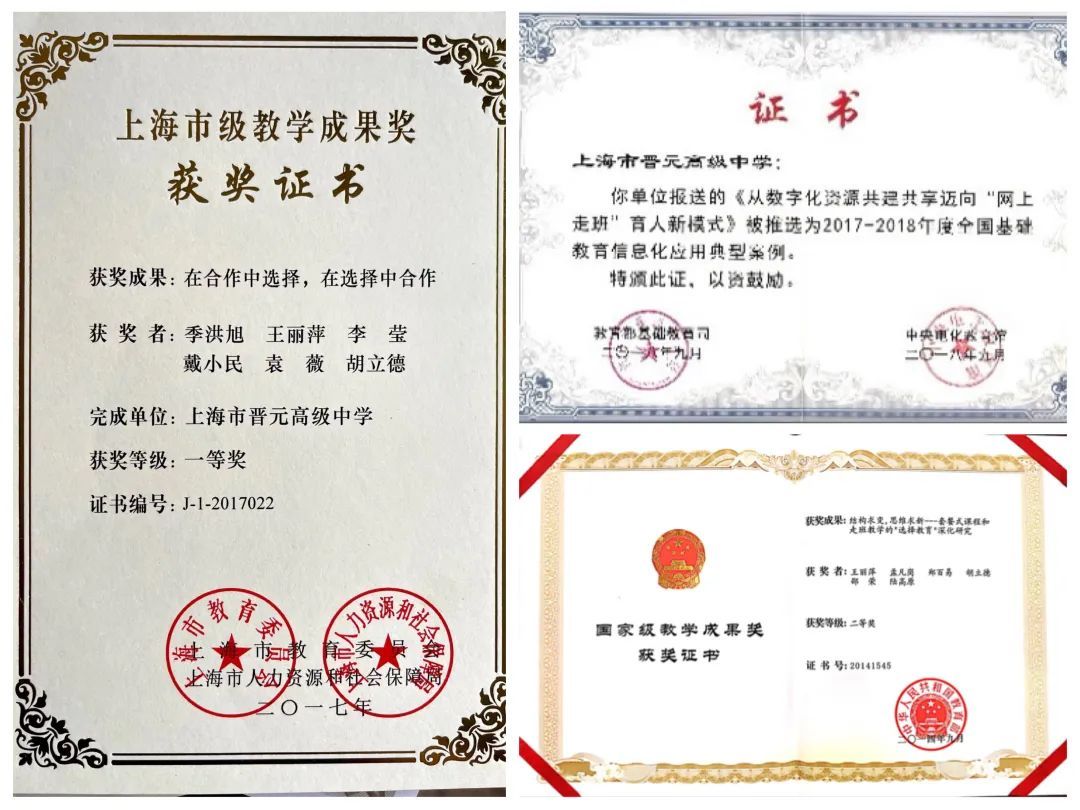 据了解,《结构求变,思维求新——套餐式课程和走班教学的“选择教育”深化研究》获国家级教学成果奖二等奖;《在合作中选择, 在选择中合作》荣获上海市教学成果奖一等奖;《网上走班:育人新模式》教学案例,入选为2018年度全国基础教育信息化应用典型示范案例,并在北京现场展示。