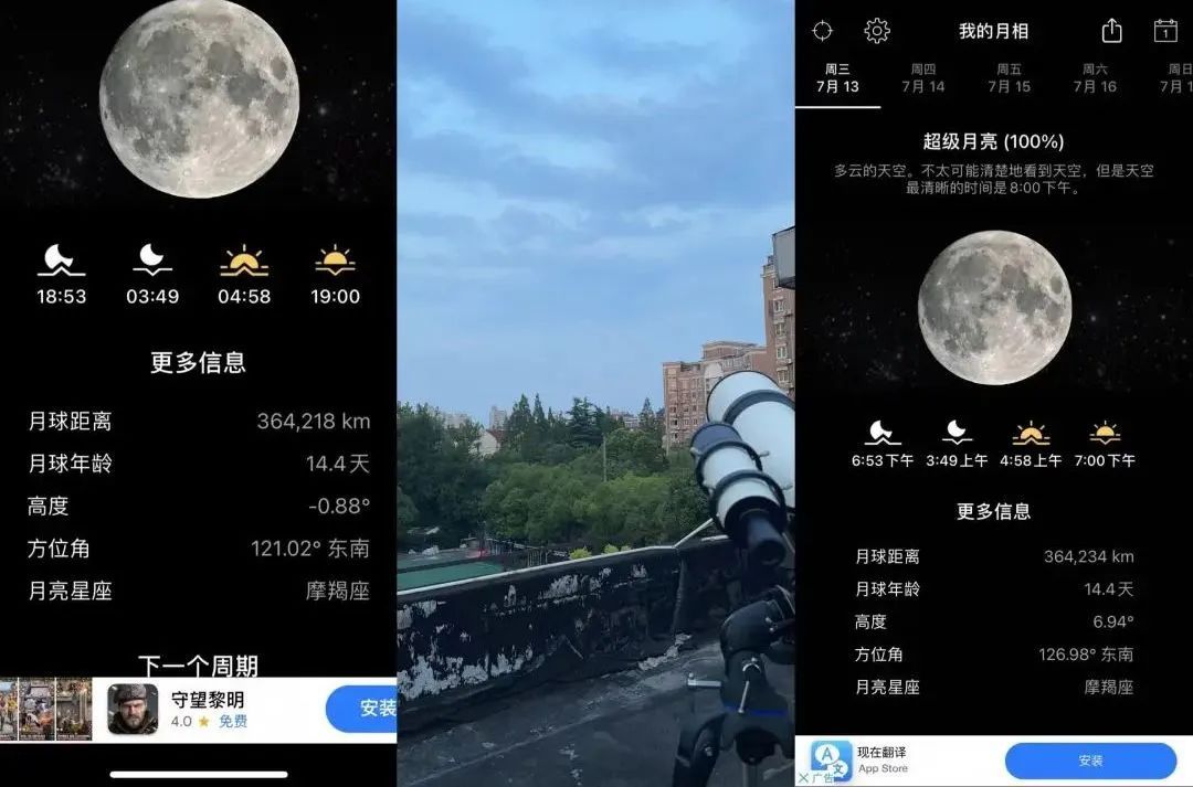 指导老师通过天文望远镜对超级月亮进行观测,并在直播间为大家实时讲解。“当月亮和太阳处于地球两侧,并且月亮和太阳的黄经相差180度时,地球上看到的月亮最圆,被称为“满月”,亦称为“望”。农历每月的十四、十五、十六甚至十七,都是满月可能出现的时段。”
