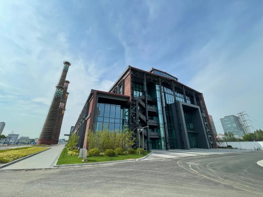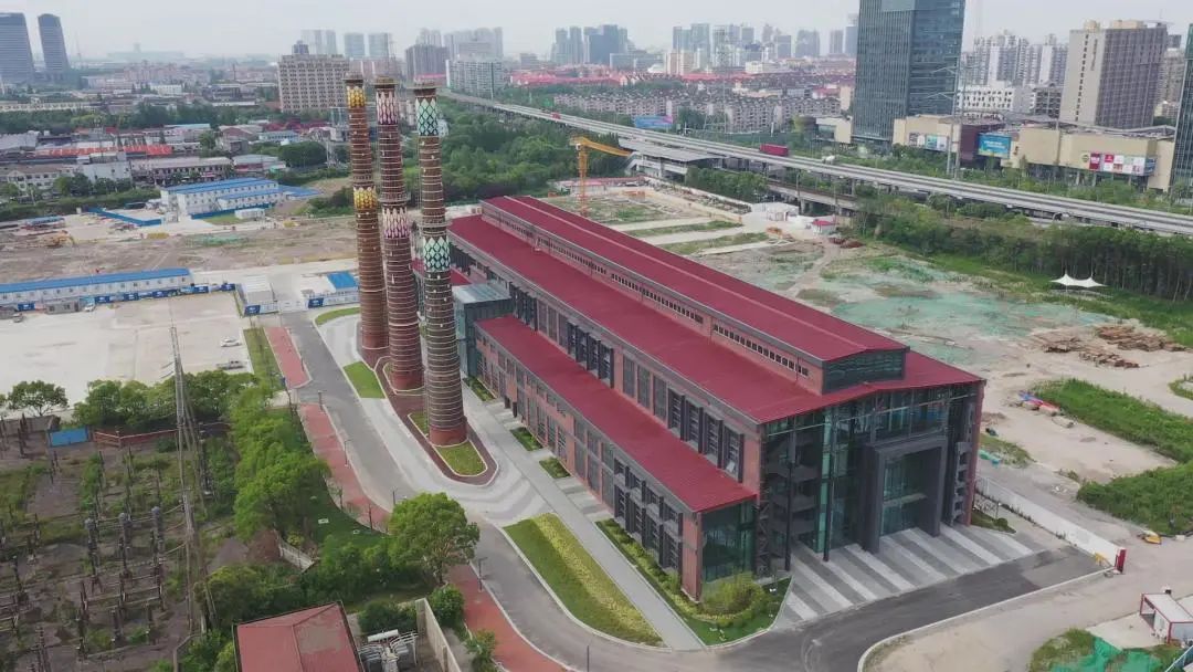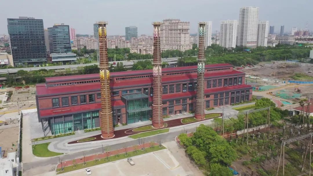 这个咖啡色的建筑群就是去年10月底已经建成的首发项目南楼,其中3座高耸的钢厂烟囱作为工业遗存被保留下来,并且进行了创新设计和装饰。六边形的外饰、丰富瑰丽的色彩组合,将南楼建筑群装扮得美轮美奂,成为吴淞创新城的一个地标。