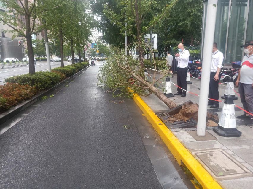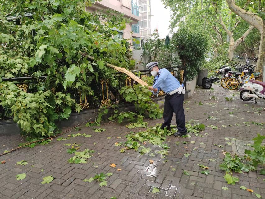 15:09,安义路、常德路人行道上,一棵树木倒塌影响非机动车道通行,静安交警支队民警沈欢、盛春贇立即到场,与周边商场保安到场将树木搬至不影响交通地点,并交由园林等部门到场进一步处置。