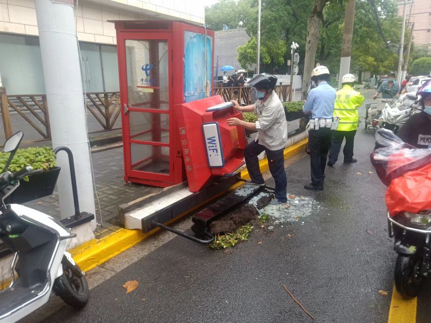 15:25,威海路、陕西路口一电话亭被大风刮倒,顶盖掀起掉落至地面,电话亭一侧玻璃破碎。正在附近执勤的静安交警方伟和盛春贇接110报警后迅速到场处置,与周边市民一起将电话亭扶正后,随即设置提醒标识疏导周围车辆,等待电信等相关部门到场移交。