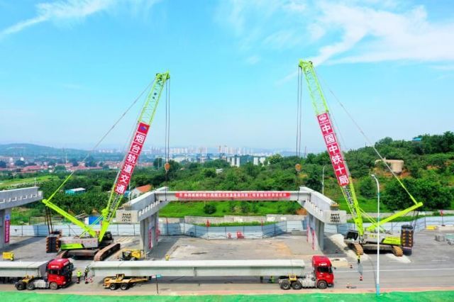 据中铁十局烟台快速路德润路项目总工程师卢继平介绍,本次架设的首榀预制箱梁全长30米,重93吨,采用专用运梁车运输,2台200吨履带吊通过双机抬吊的方式进行配合安装。现场由专业起重作业人员统一指挥架设。两台吊车同步缓慢将箱梁吊起升空,当箱梁的起吊高度超过桥台(桥墩)盖梁面时,通过吊车的侧向转臂,将吊起的箱梁转入安装区域,履带吊的同步倾臂操作使其准确入位,最终实现吊装的同步提升、同步转向、同步落梁。